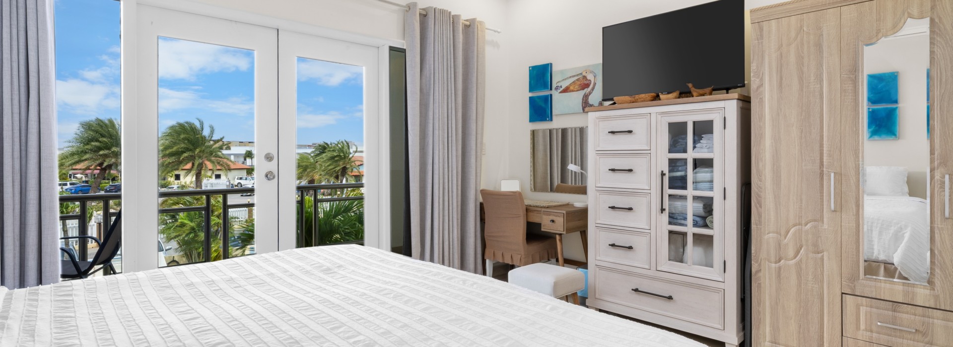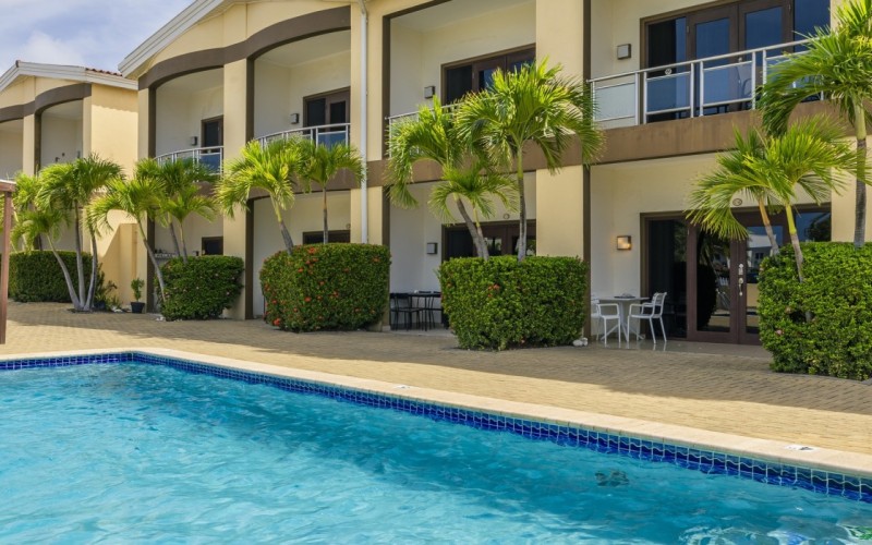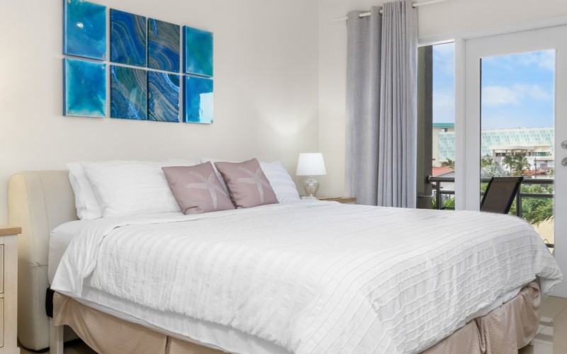 A primary suite balcony with beautiful western views overlooking the pool and glimpses of Eagle Beach
