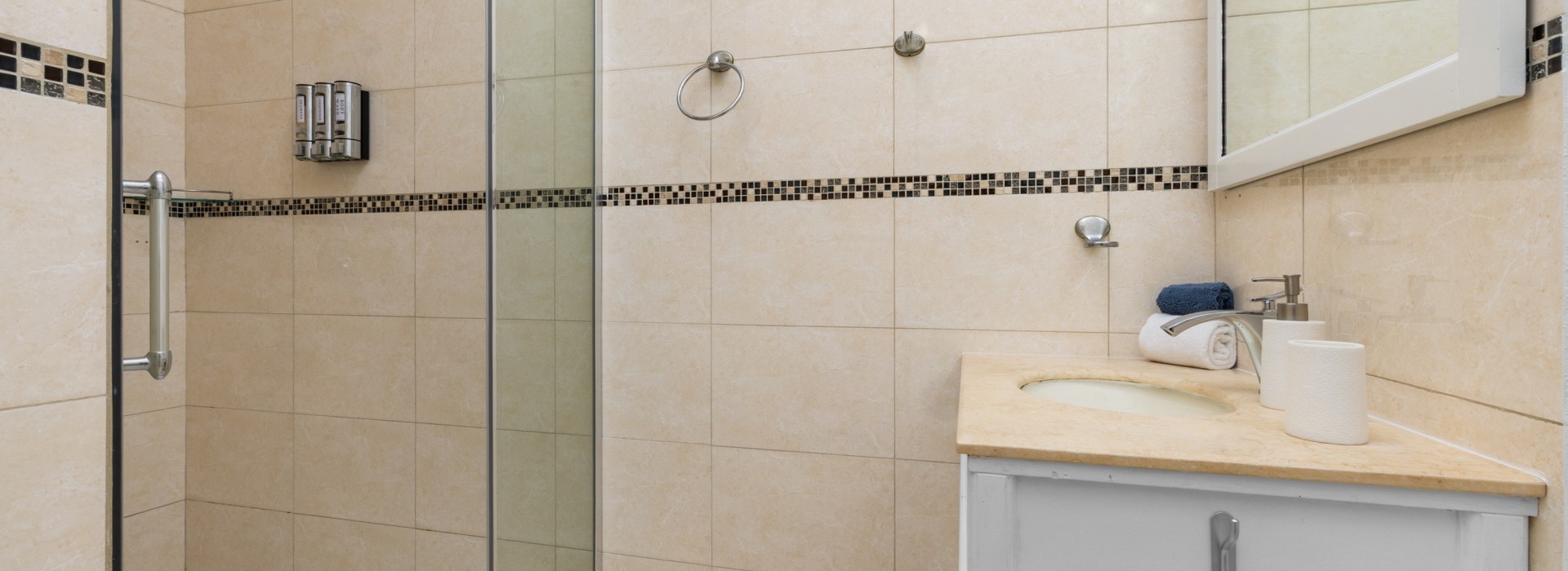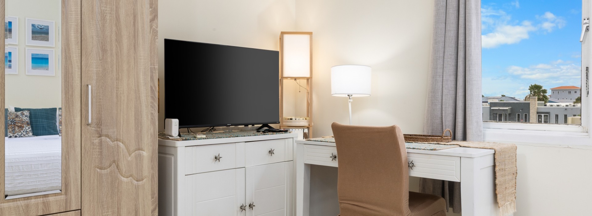 Two spacious bedrooms, each with a king bed, dedicated workspace/desk, smart TV, and private ensuite bathroom