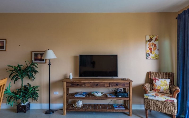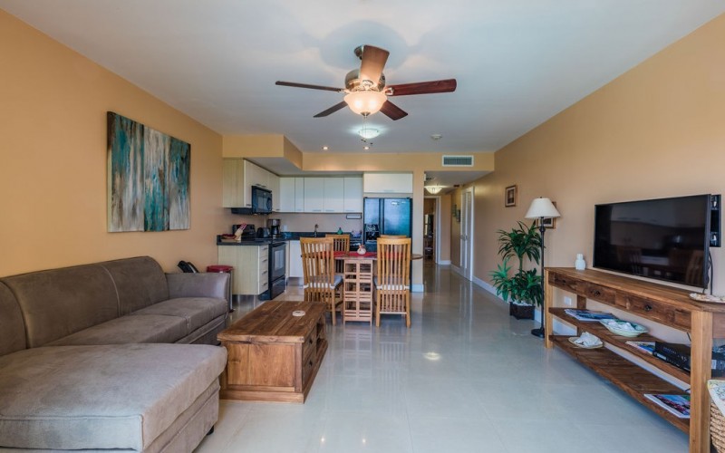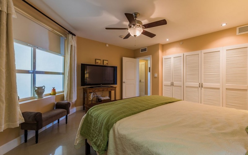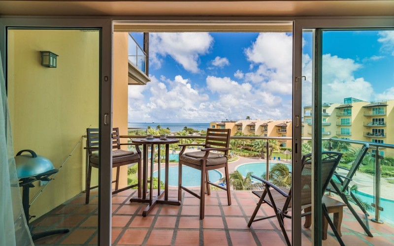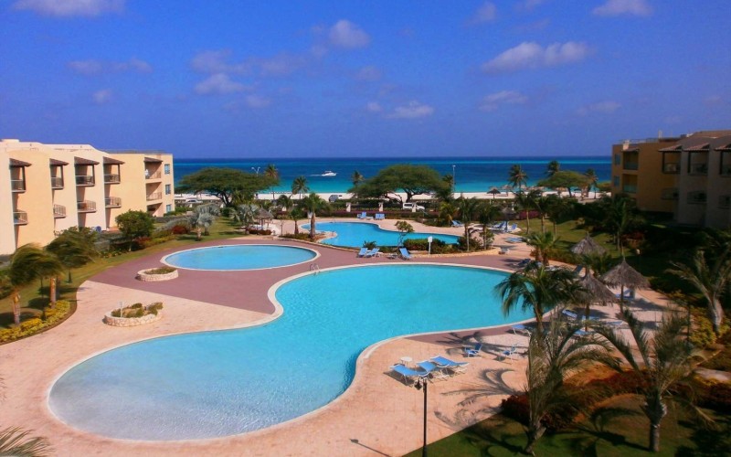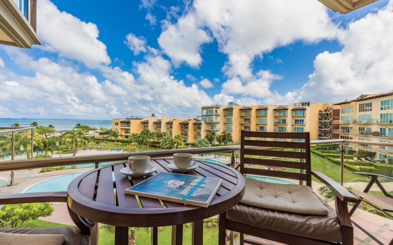 This 4th-floor condo offers a private balcony with breathtaking panoramic views of the ocean and pool. Let the beauty of Eagle Beach surround you.