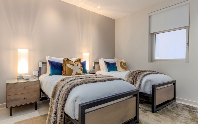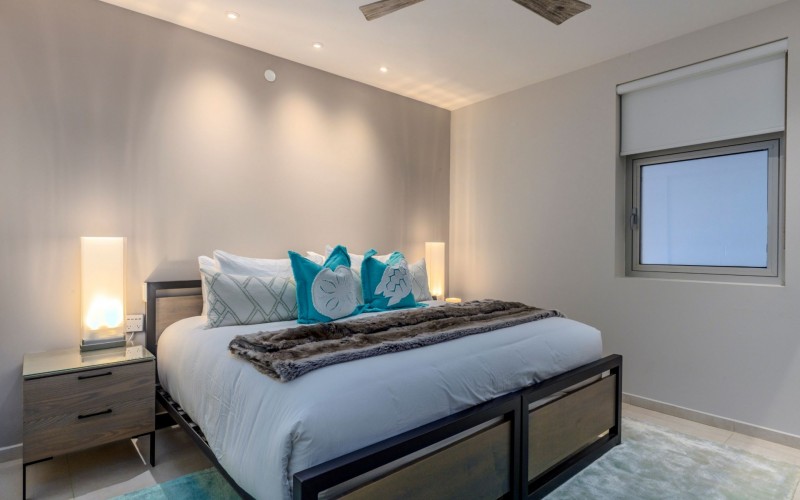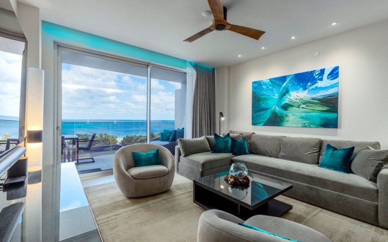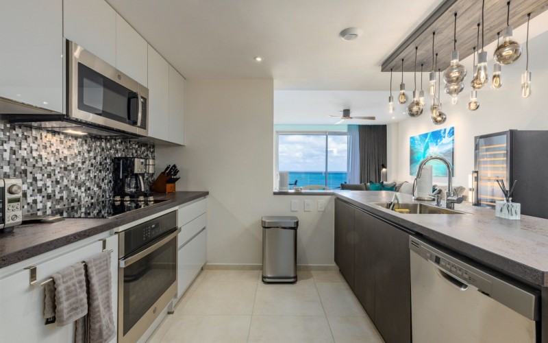 Indulge in high-end amenities, from the sleek, modern design of the open-concept living area and chef's kitchen to the plush bedding and linens in the comfortable beds. Every detail is meticulously crafted for your luxury and comfort. The expansive primary bedroom suite opens to a large balcony overlooking the Caribbean Sea. Featuring a king bed, ceiling fan, smart TV, large walk-in closet, and a spa-like bathroom with a double vanity, shower for two, and a separate water closet.