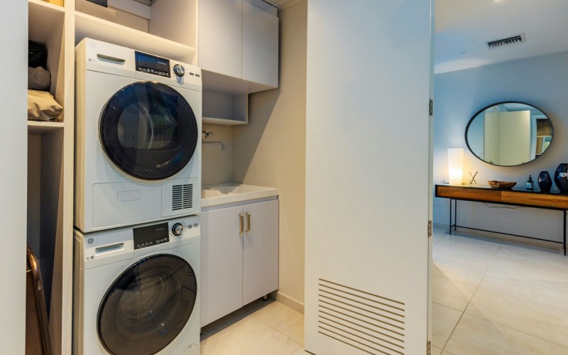 Enjoy modern conveniences such as a front-load washer and dryer, powder room, safe, high-speed internet, large alfresco dining table, comfortable lounging beds on the balcony, and a kitchen island with seating for six. Additional amenities include beach chairs, a cooler, games, and underground parking.