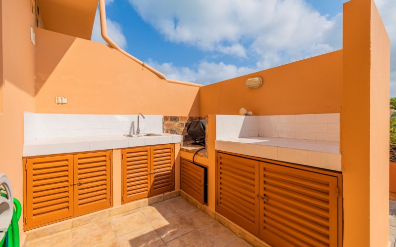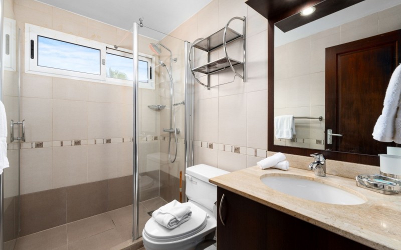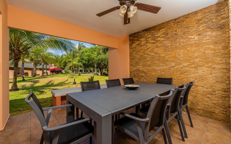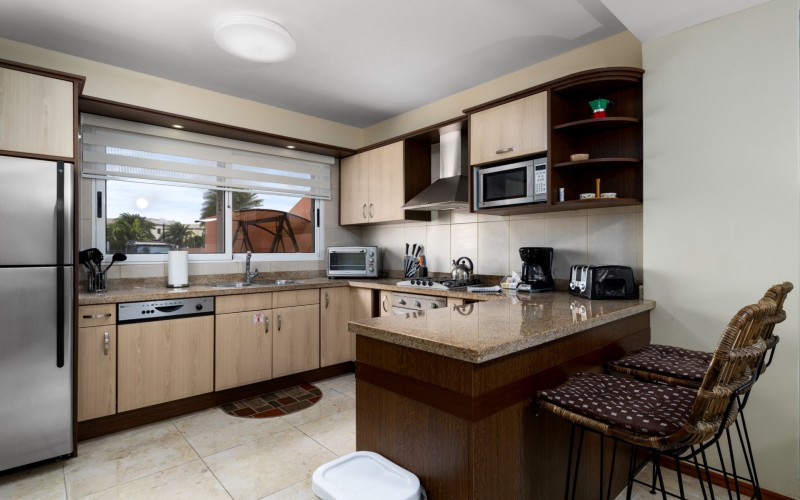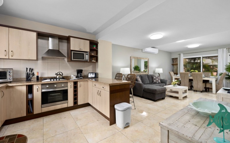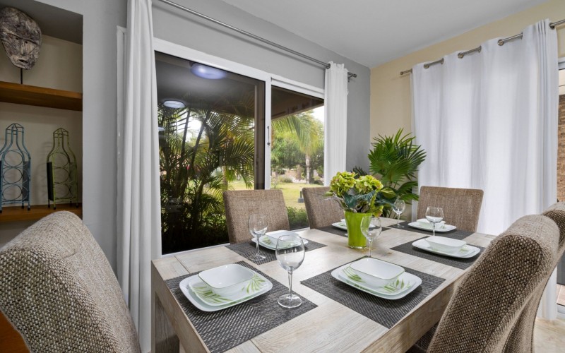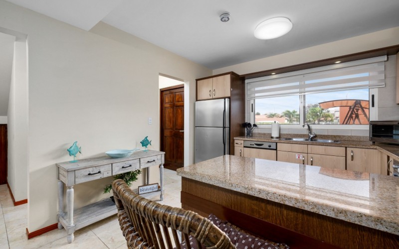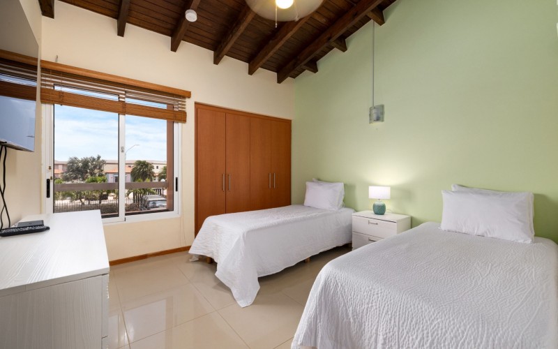 Escape to your own slice of paradise at Jardines Del Mar, where luxury meets tranquility just steps away from the pristine shores of Eagle Beach. This spacious 3-bedroom, 3-bathroom townhome offers the perfect retreat for large families or groups seeking an unforgettable Aruban experience. Step inside to discover a large, open living area designed for comfort and togetherness. Gather around the breakfast bar or dining table for family meals, unwind on comfortable sofas, and enjoy entertainment with a smart TV. The second floor hosts a spacious primary suite with a comfortable Queen bed, balcony, walk-in closet, and a private ensuite bath with double vanity for ultimate luxury. Two guest rooms offer additional family friendly space with 2 single beds, and 2 bunk beds accommodating up to 6 additional people. Two additional full guest baths ensures ample facilities for everyone. Guests can unwind in two private patio areas amidst the tropical surroundings. Ideal for large families, this townhome provides essential amenities for a comfortable and enjoyable getaway. Enjoy BBQ grill sessions, laundry convenience with a washer/dryer, entertainment with smart TVs, inside and outside dining areas, beach chairs, cooler, access to the on-site gym, and refreshing pool dips.