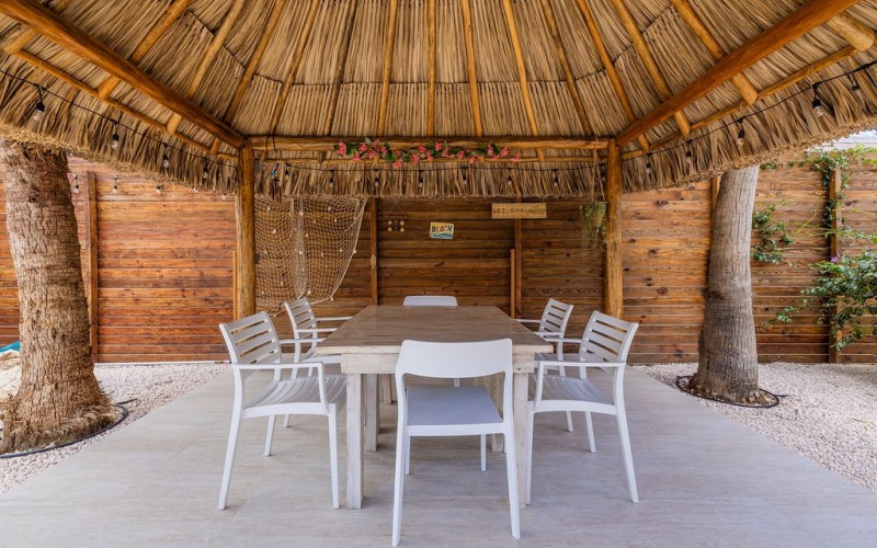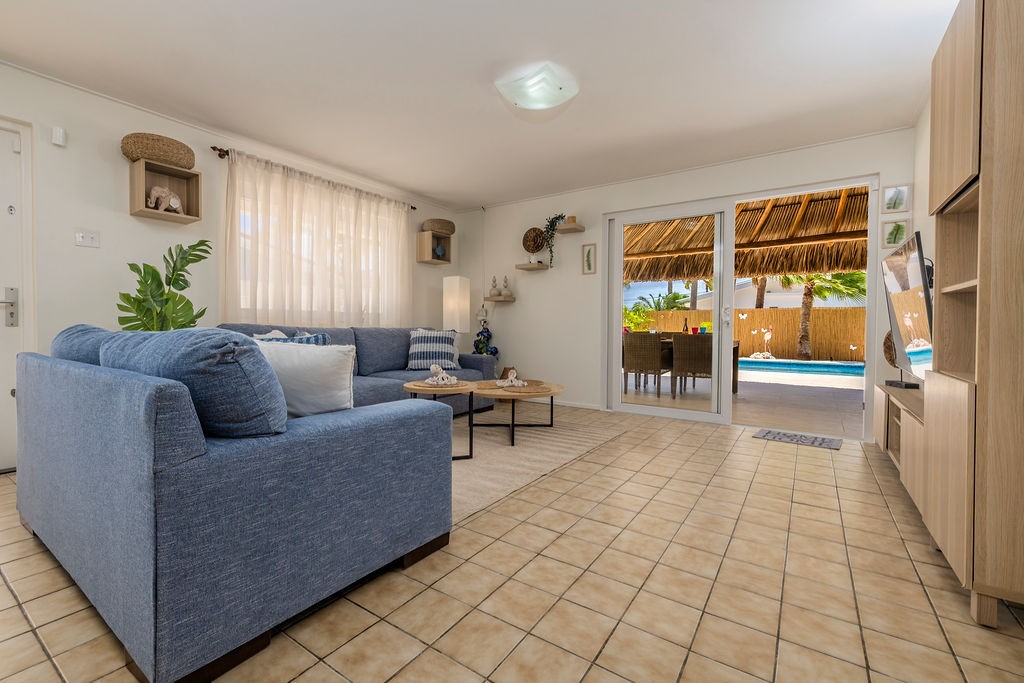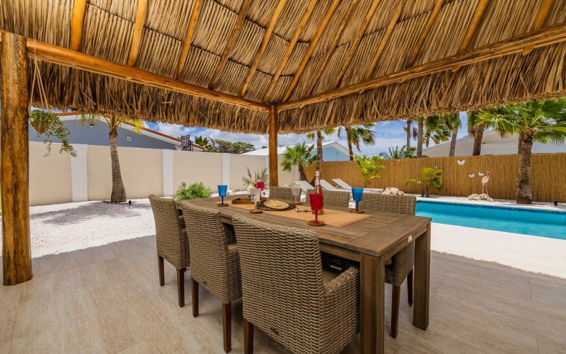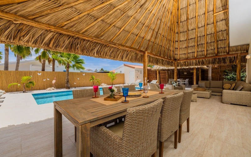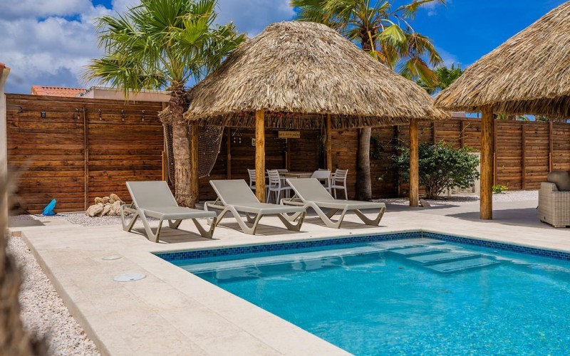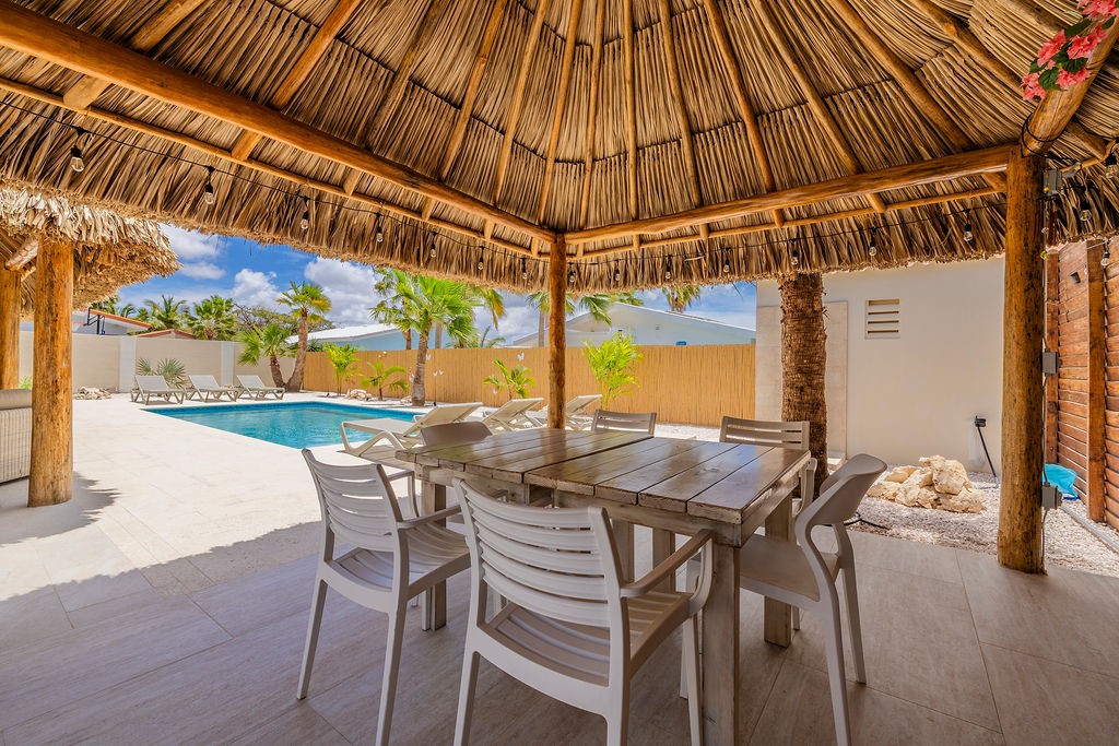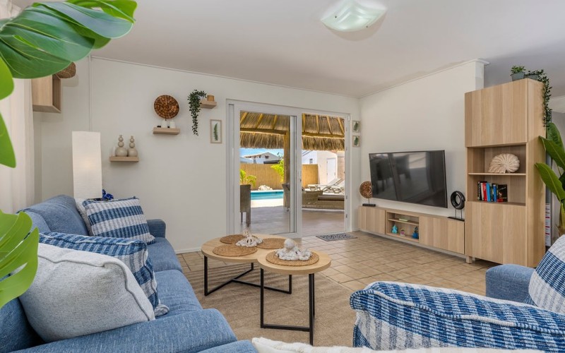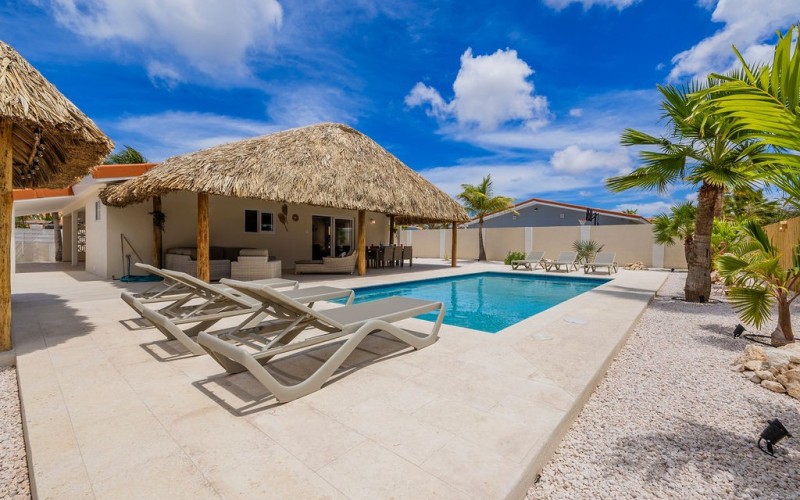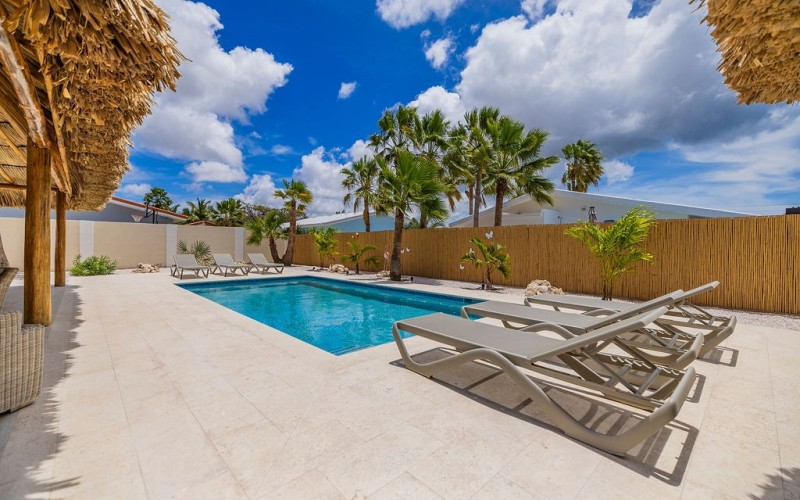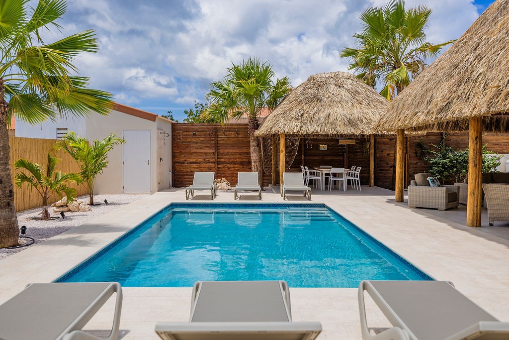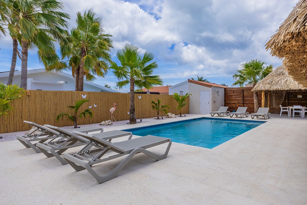 Welcome to Palapa Paradise Escape, a beautifully renovated 3-bedroom, 2-bathroom home featuring a large saltwater pool and multiple outdoor living spaces designed to enjoy Aruba’s sunshine and refreshing trade winds.