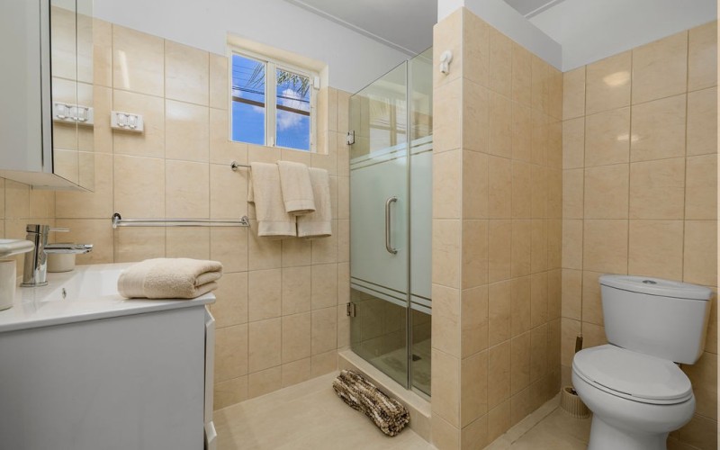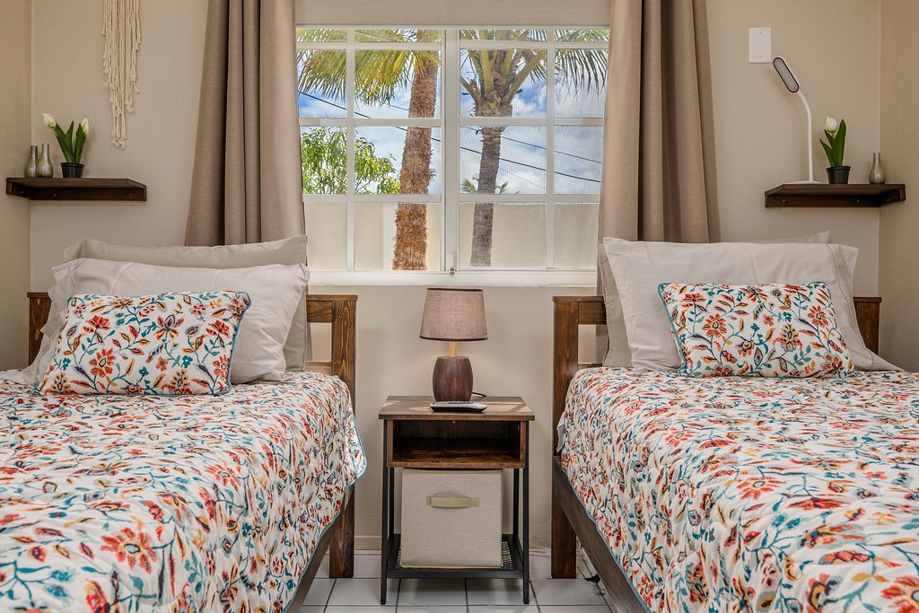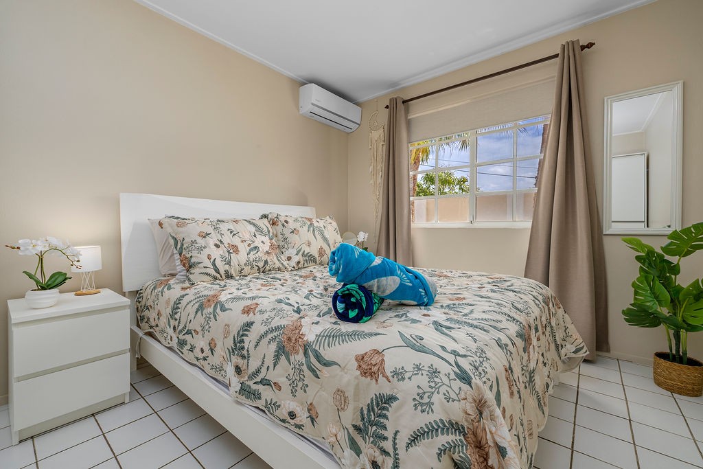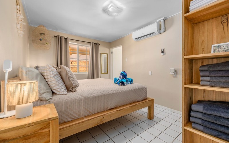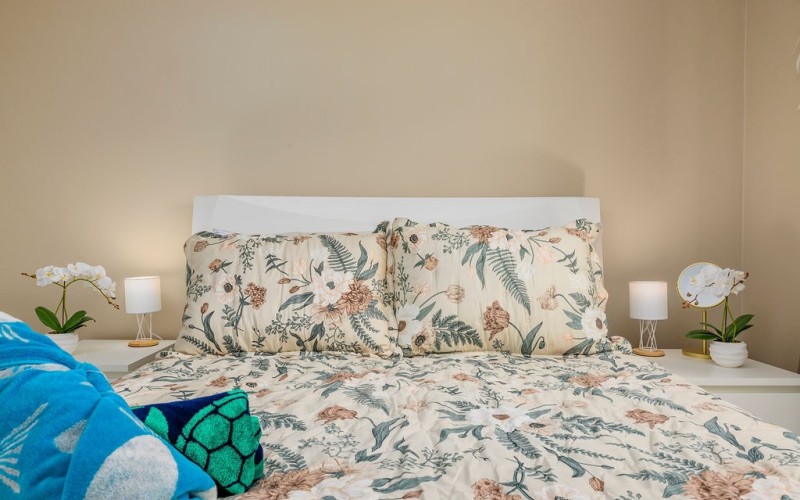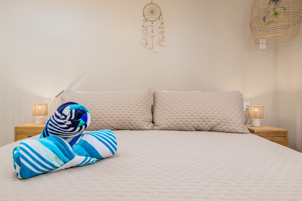 The primary bedroom suite features a California king bed complete with plush pillow top mattress, and a private ensuite bathroom for ultimate comfort and privacy. Two guest bedrooms share a full bathroom. Guest Bedroom 1 boosts a Queen bed perfect for stretching out after a full day of sunshine. Guest Bedroom 2 features Two single beds that can easily convert into a king to accommodate another couple or 2 singles.
