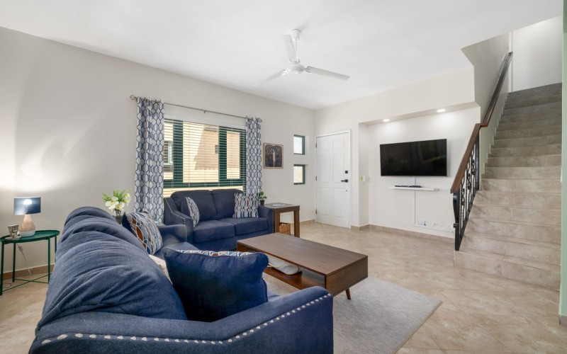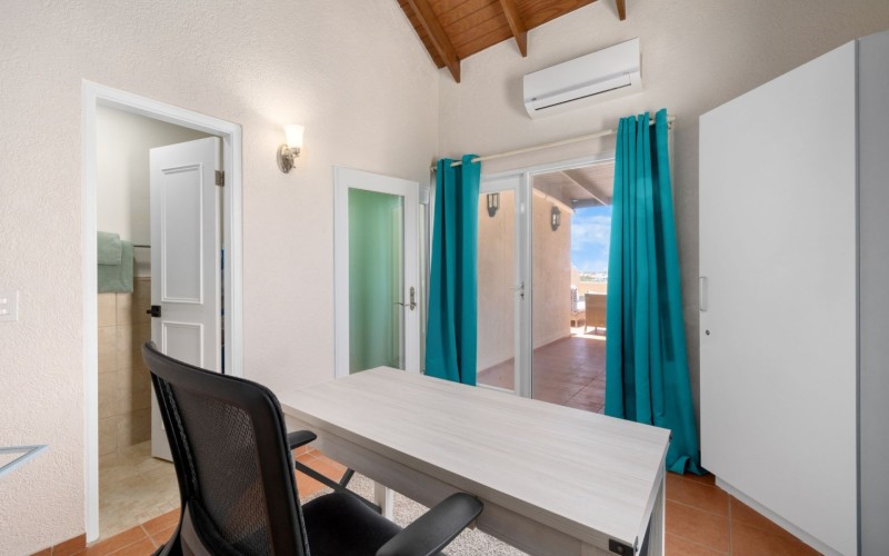 The primary bedroom boasts a comfortable king bed, a private ensuite with a double vanity, relaxing soaker tub, and an enclosed glass shower. Two additional spacious bedrooms each feature queen beds and share a modern bathroom. The open-concept living area includes a dining table with seating for six and additional seating at the breakfast bar. The modern kitchen is fully equipped with everything you need for preparing meals and entertaining. Comfortable seating areas provide ample space to relax and unwind. Just off the living/ dining area, you'll find a beautiful terrace perfect for outdoor dining with sea and golf course views. Ascend the staircase to the upper level to access the private office space, and spacious rooftop terrace offers breathtaking, sprawling views of the island, making it an ideal spot for enjoying the sunset or stargazing at night.