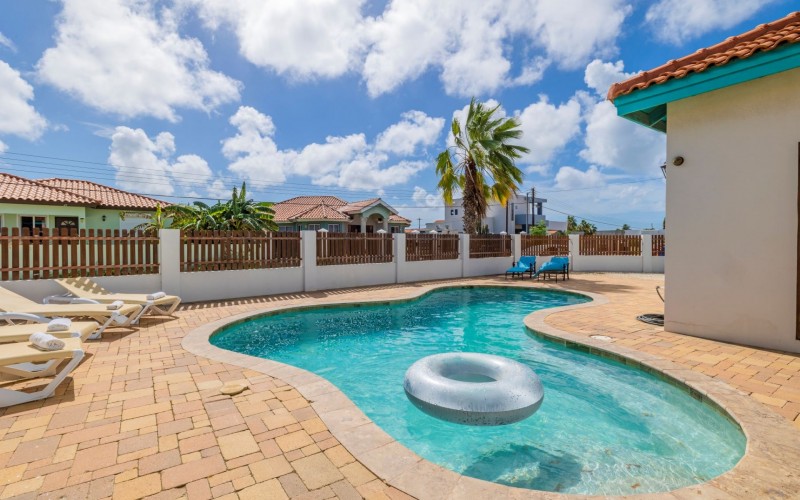 Nestled close to Eagle Beach and Super Foods, just 0.8 miles from the bustling high-rise hotel district, sits a beautiful U-shaped house that embraces the essence of island living. This enchanting retreat is perfect for large groups and extended families, offering not just a vacation home but an experience to cherish.