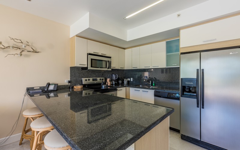 The open living area, adorned with a sleeper sofa for guests, seamlessly connects to your private patio. Bask in the sea breeze and embrace outdoor living. The kitchen boasts a breakfast bar, granite countertops, and stainless appliances, including a dishwasher. Retreat to the primary bedroom, adorned with a comfortable queen bed. Relax and unwind in a space designed for tranquility.