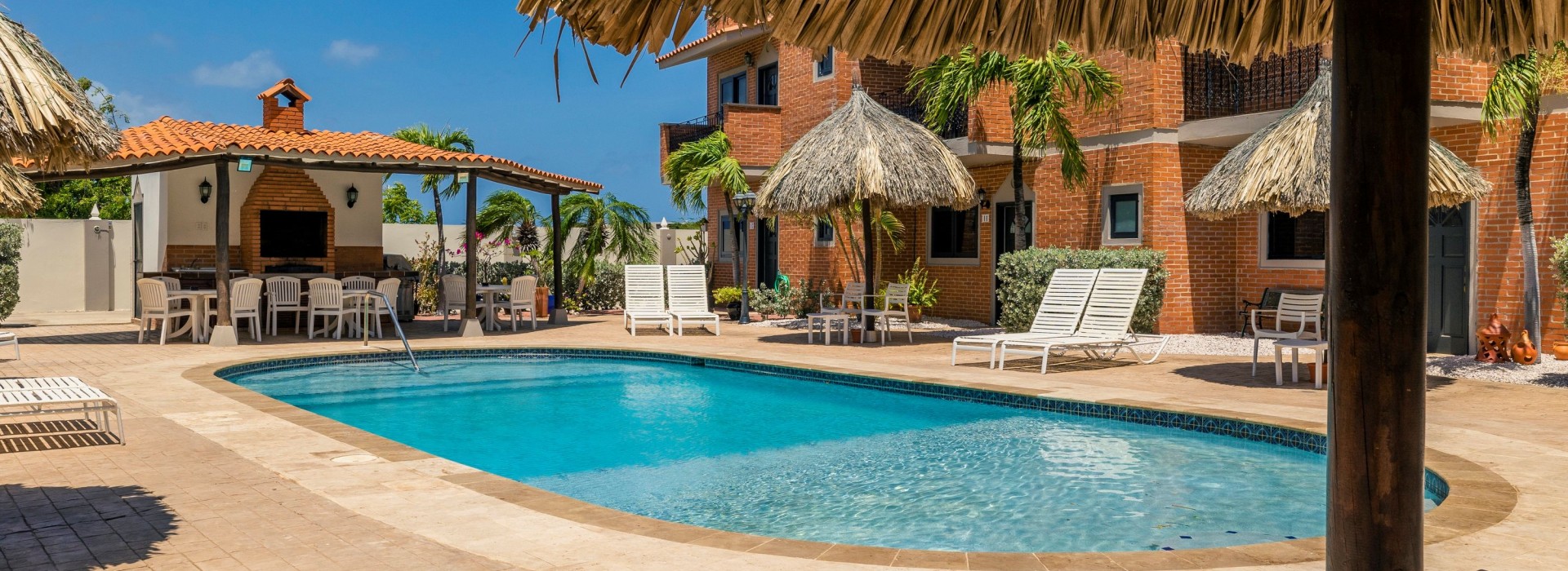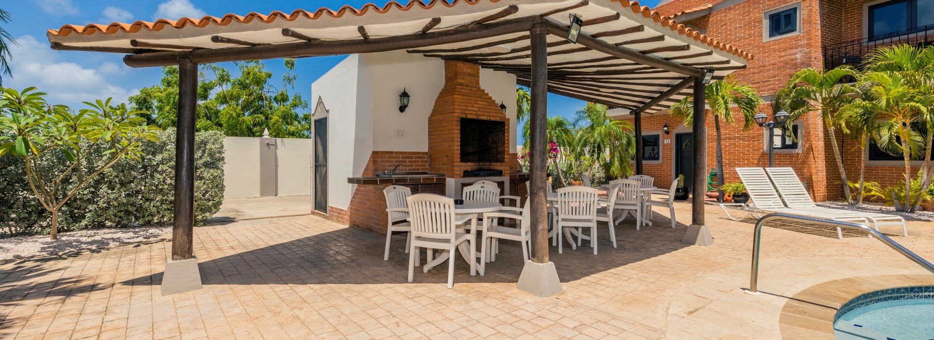 Step outside your door into a tropical paradise—enjoy a shaded palapa, sparkling community pool, plenty of lounge chairs, and a shared BBQ area perfect for outdoor cooking and relaxation.