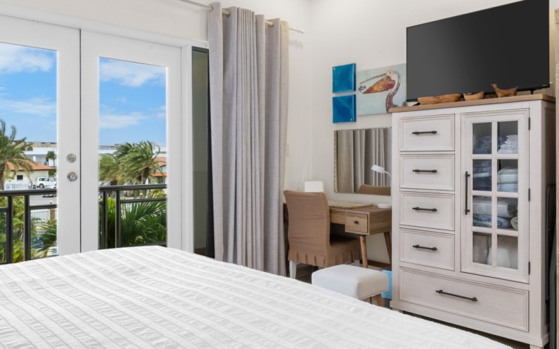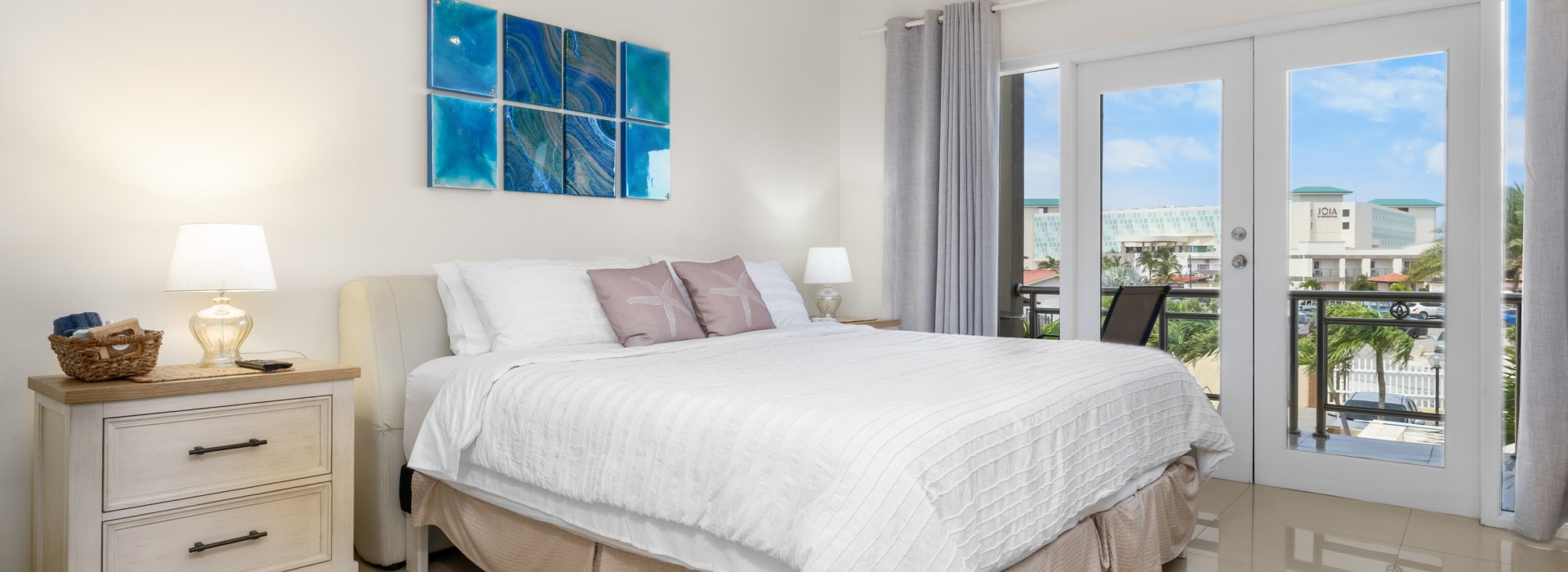 A primary suite balcony with beautiful western views overlooking the pool and glimpses of Eagle Beach