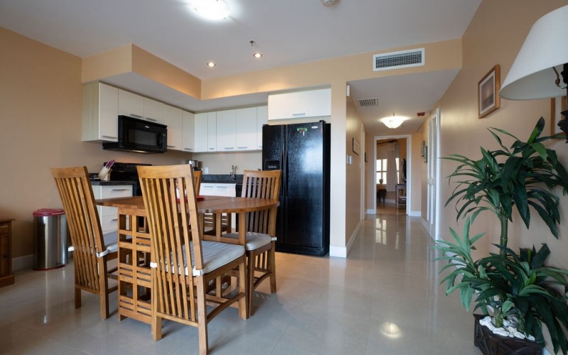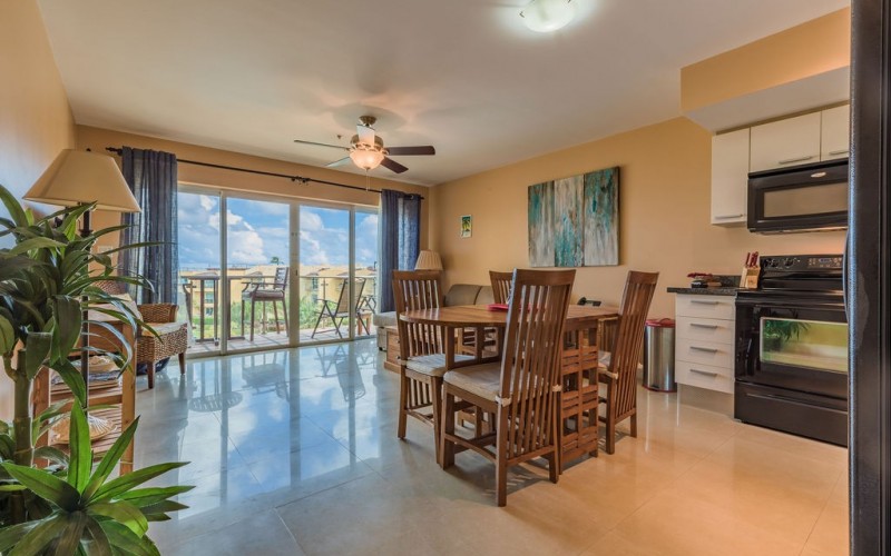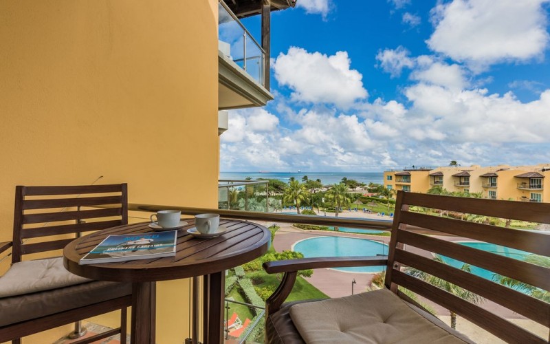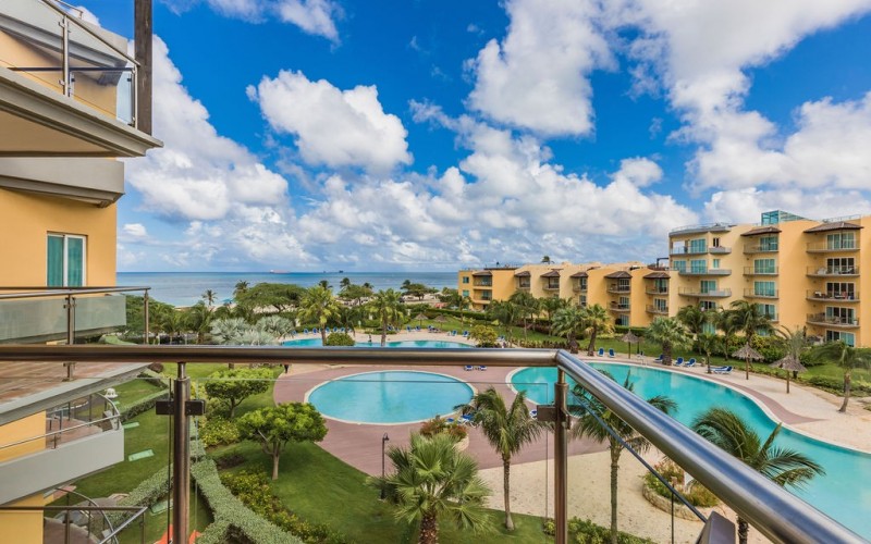 This 4th-floor condo offers a private balcony with breathtaking panoramic views of the ocean and pool. Let the beauty of Eagle Beach surround you.
