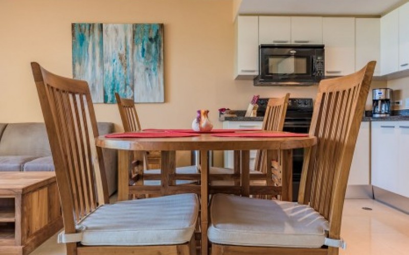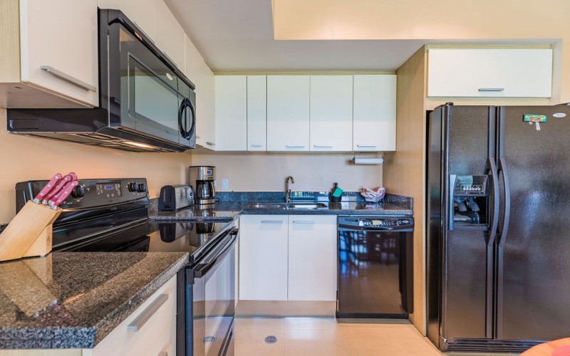 The open living area, adorned with a sleeper sofa for guests, invites relaxation and connection. Seamless transitions lead to your private balcony, creating additional outdoor living space. The kitchen, featuring granite countertops and stainless appliances (including a dishwasher), is a culinary haven. A dining table for 4 provides a perfect setting for meals with loved ones. The main bedroom boasts a large, comfortable king bed, ensuring a restful night's sleep. Wake up to the sights & sounds of the sea and the promise of another day in paradise.