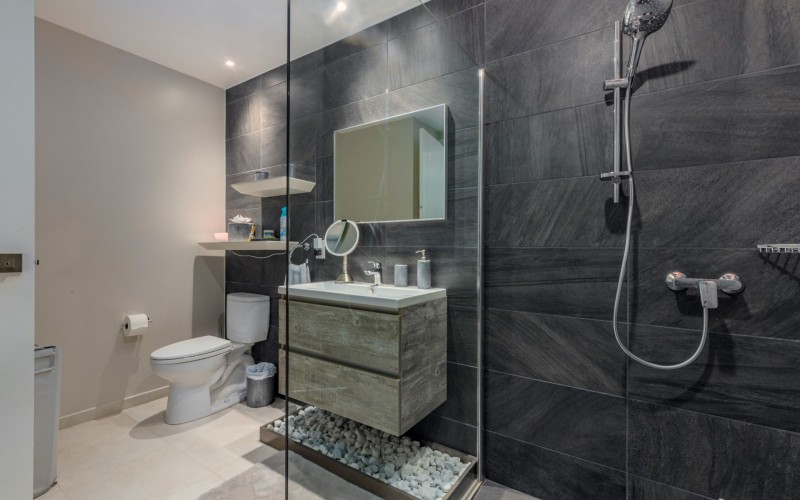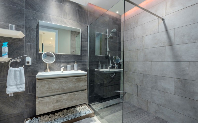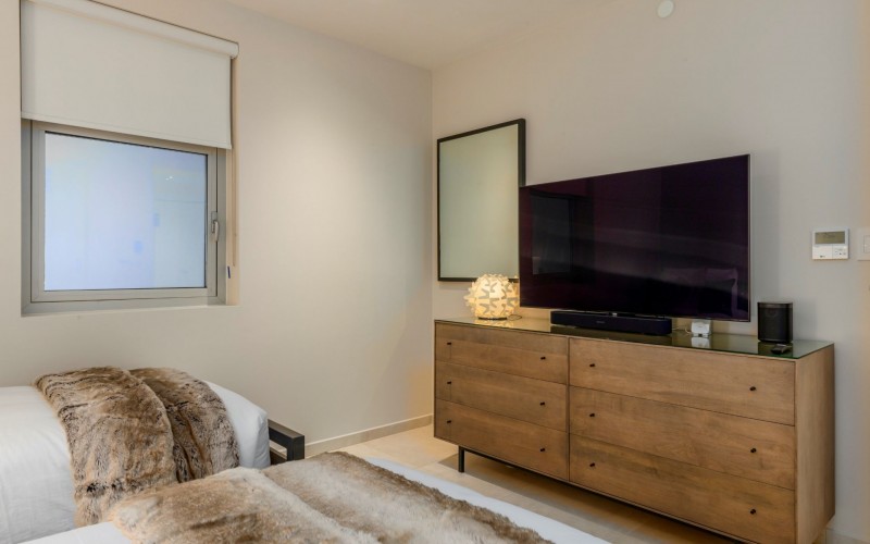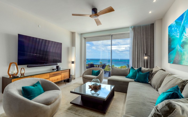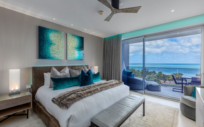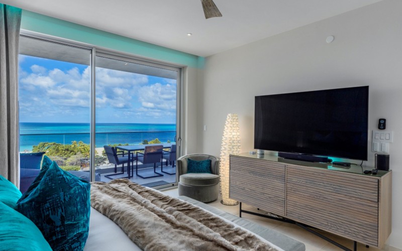 Indulge in high-end amenities, from the sleek, modern design of the open-concept living area and chef's kitchen to the plush bedding and linens in the comfortable beds. Every detail is meticulously crafted for your luxury and comfort. The expansive primary bedroom suite opens to a large balcony overlooking the Caribbean Sea. Featuring a king bed, ceiling fan, smart TV, large walk-in closet, and a spa-like bathroom with a double vanity, shower for two, and a separate water closet.