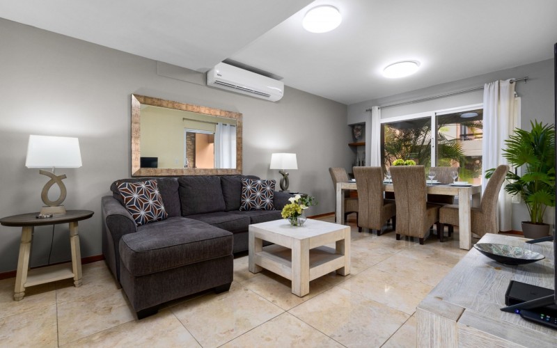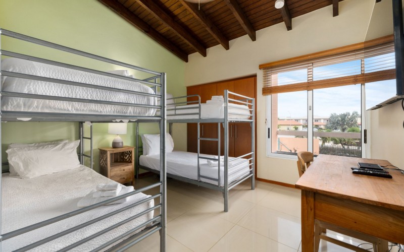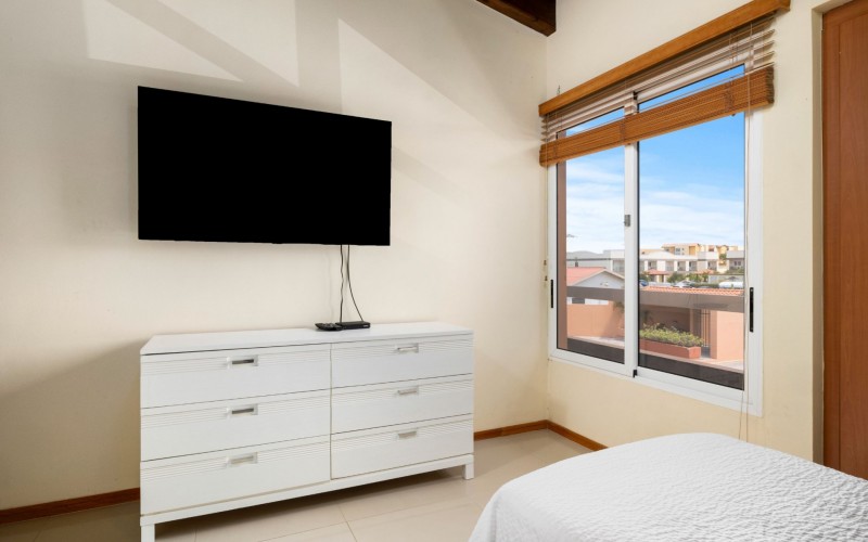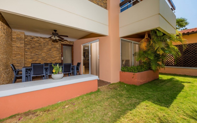Escape to your own slice of paradise at Jardines Del Mar, where luxury meets tranquility just steps away from the pristine shores of Eagle Beach. This spacious 3-bedroom, 3-bathroom townhome offers the perfect retreat for large families or groups seeking an unforgettable Aruban experience. Step inside to discover a large, open living area designed for comfort and togetherness. Gather around the breakfast bar or dining table for family meals, unwind on comfortable sofas, and enjoy entertainment with a smart TV. The second floor hosts a spacious primary suite with a comfortable Queen bed, balcony, walk-in closet, and a private ensuite bath with double vanity for ultimate luxury. Two guest rooms offer additional family friendly space with 2 single beds, and 2 bunk beds accommodating up to 6 additional people. Two additional full guest baths ensures ample facilities for everyone. Guests can unwind in two private patio areas amidst the tropical surroundings. Ideal for large families, this townhome provides essential amenities for a comfortable and enjoyable getaway. Enjoy BBQ grill sessions, laundry convenience with a washer/dryer, entertainment with smart TVs, inside and outside dining areas, beach chairs, cooler, access to the on-site gym, and refreshing pool dips.