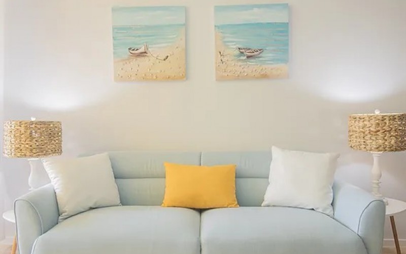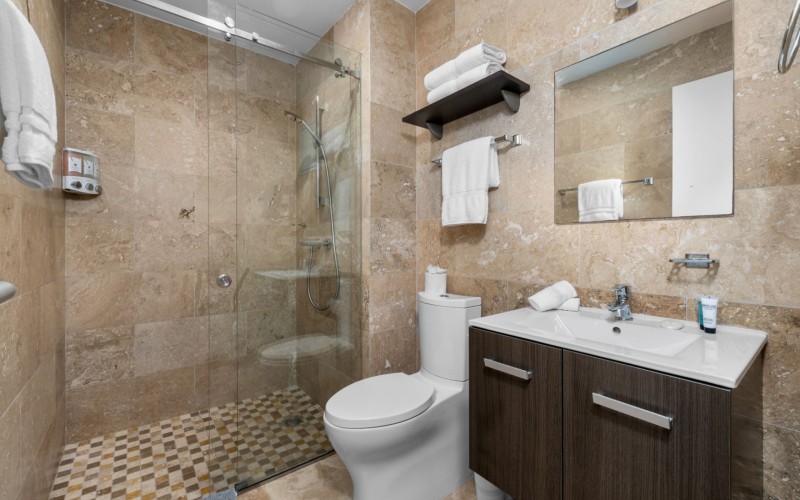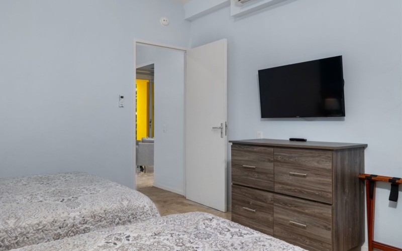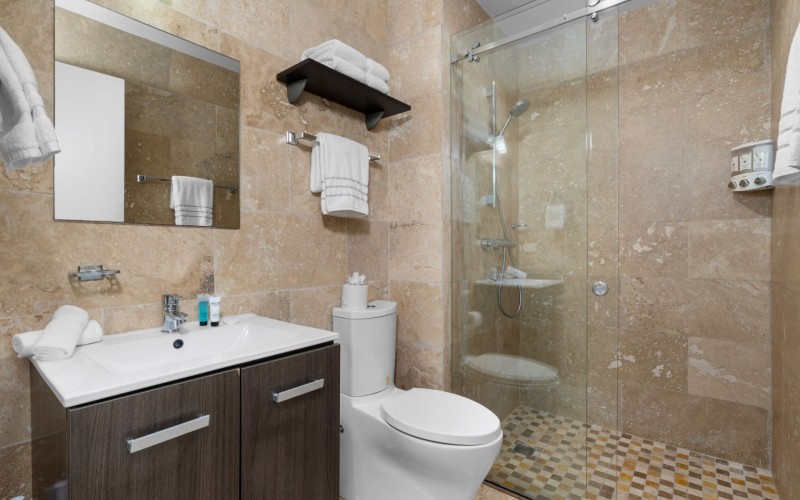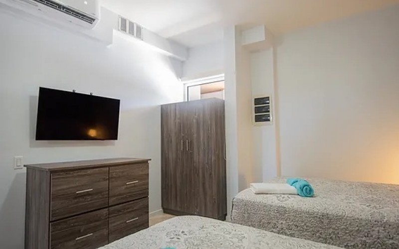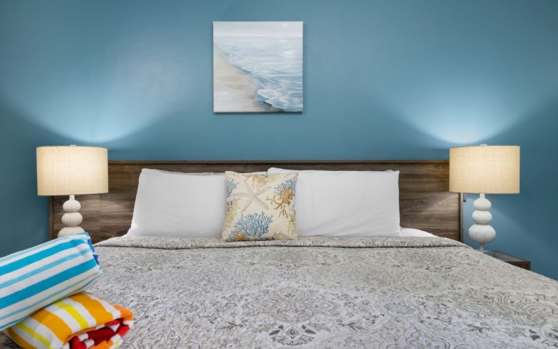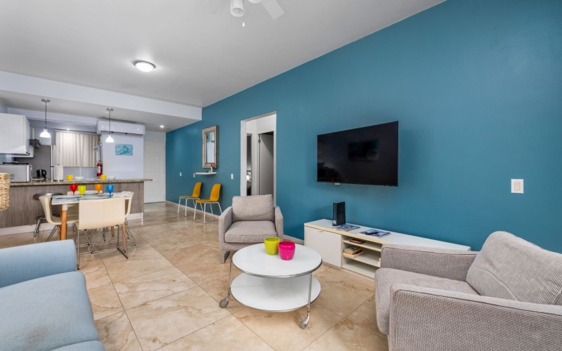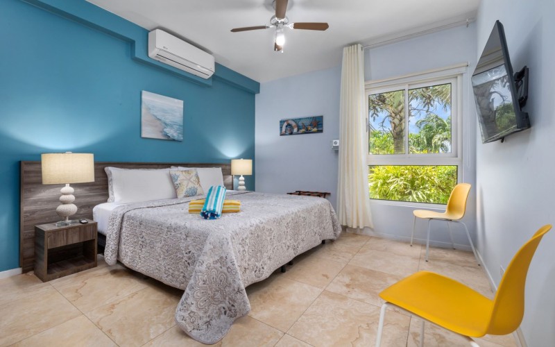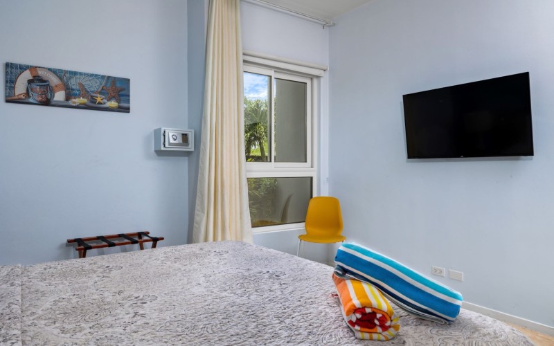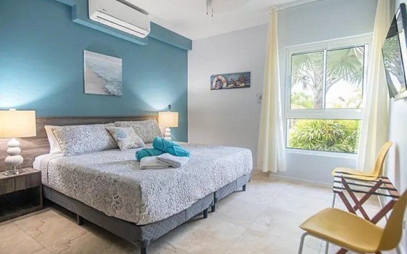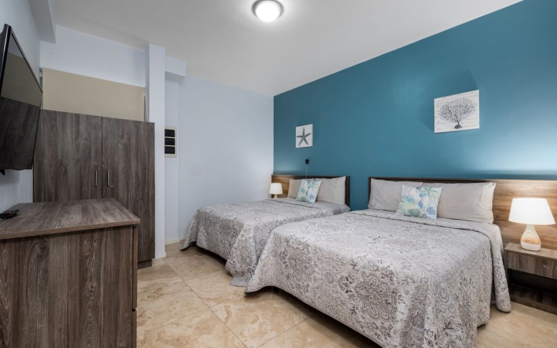 The primary bedroom decorated in tropical shades of blue features a king bed, plenty of closet space, a smart TV, and en suite bathroom making it the perfect sanctuary to retire at the end of the day. The guest room decorated in the same soothing colors boasts 2 double beds, and a smart TV with a guest bath steps away.
