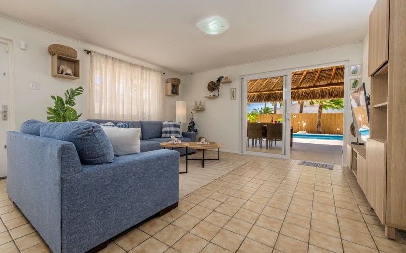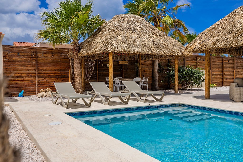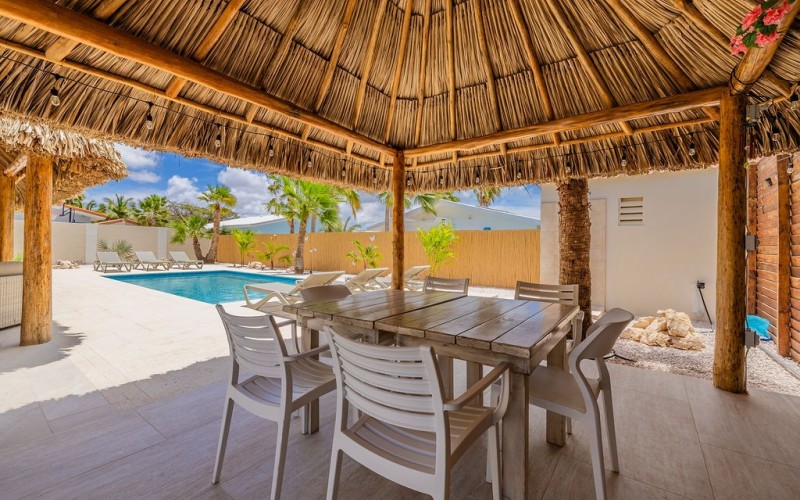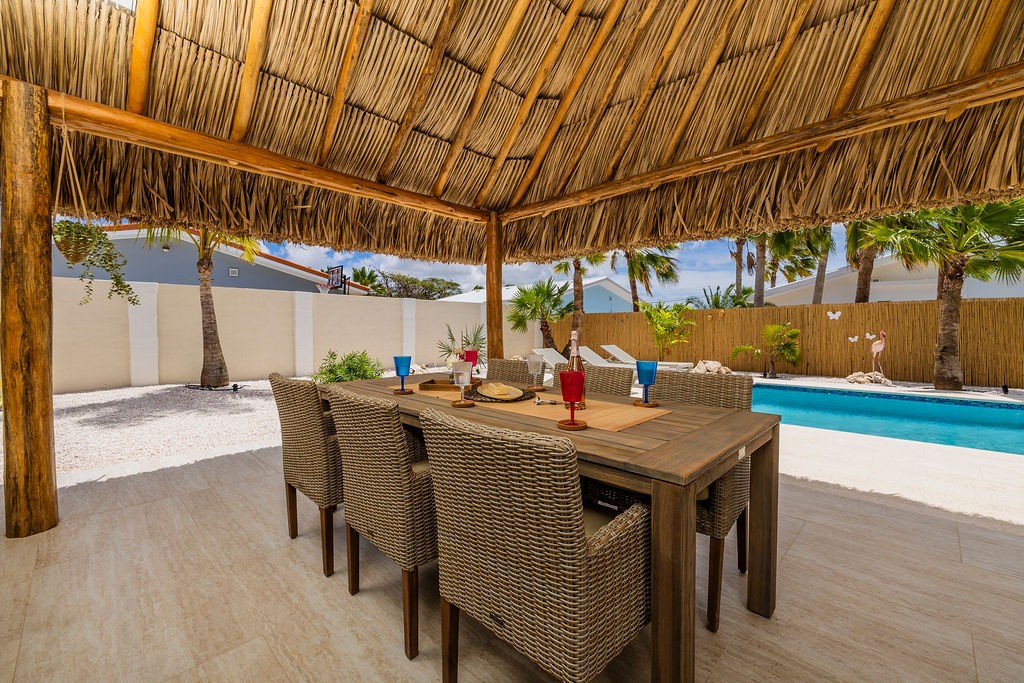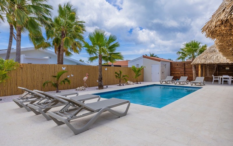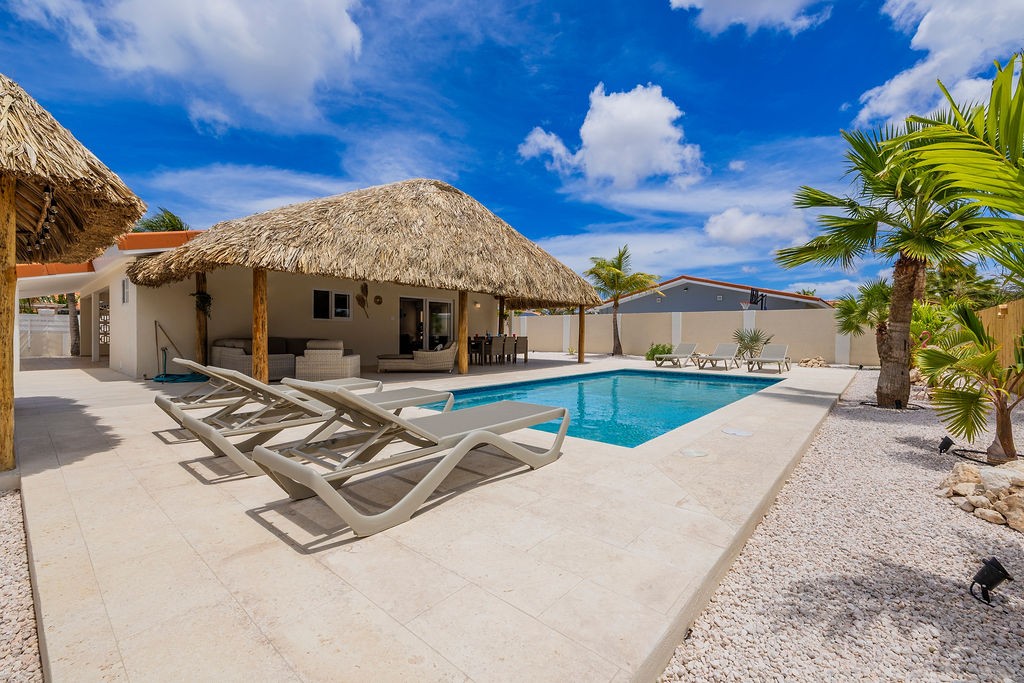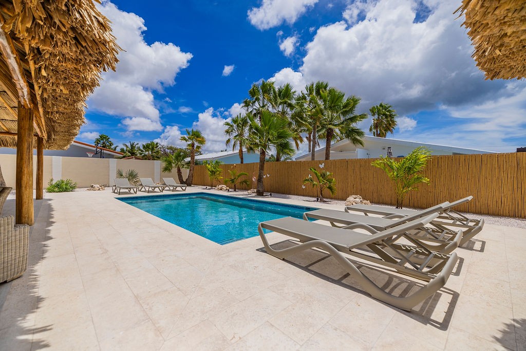 Welcome to Palapa Paradise Escape, a beautifully renovated 3-bedroom, 2-bathroom home featuring a large saltwater pool and multiple outdoor living spaces designed to enjoy Aruba’s sunshine and refreshing trade winds.