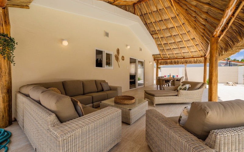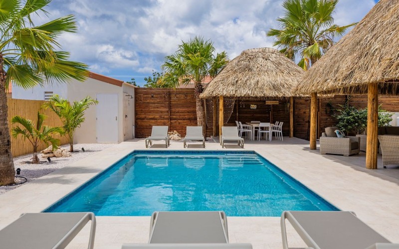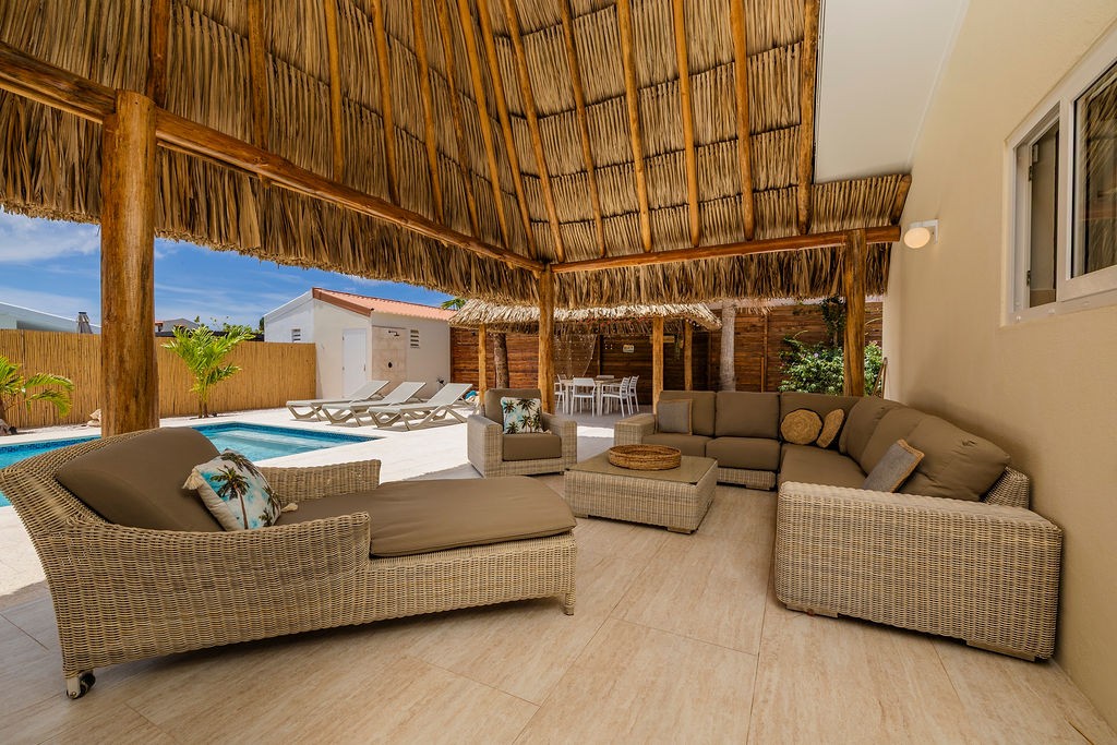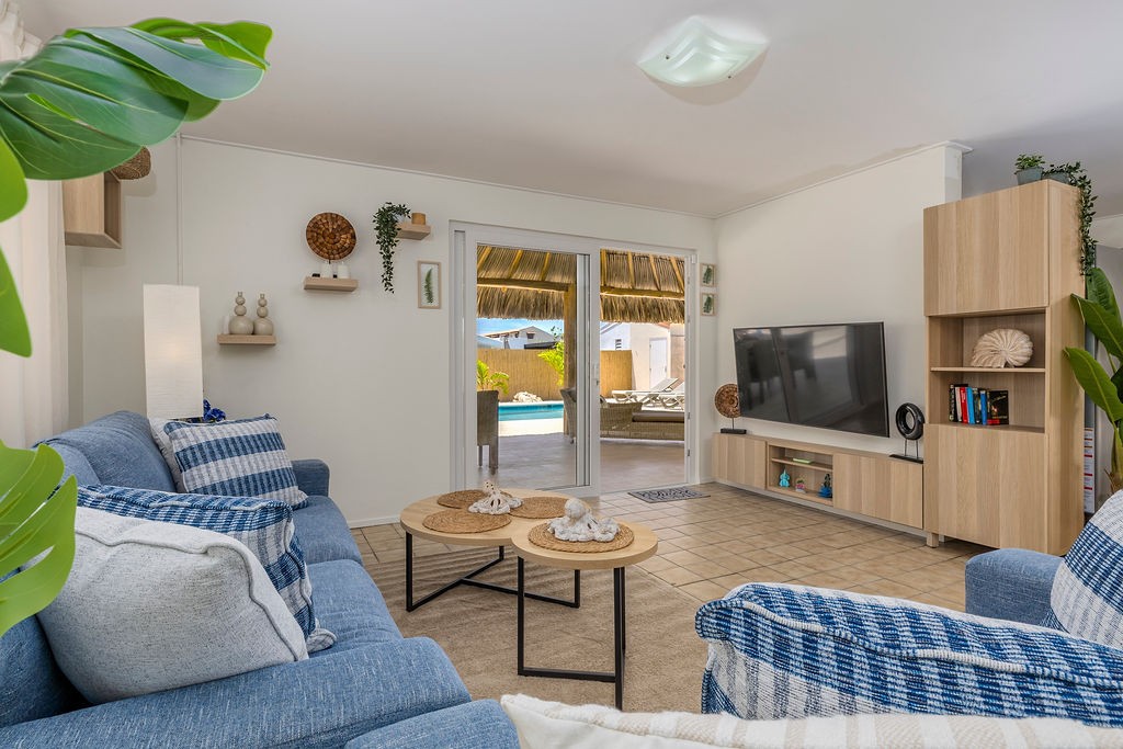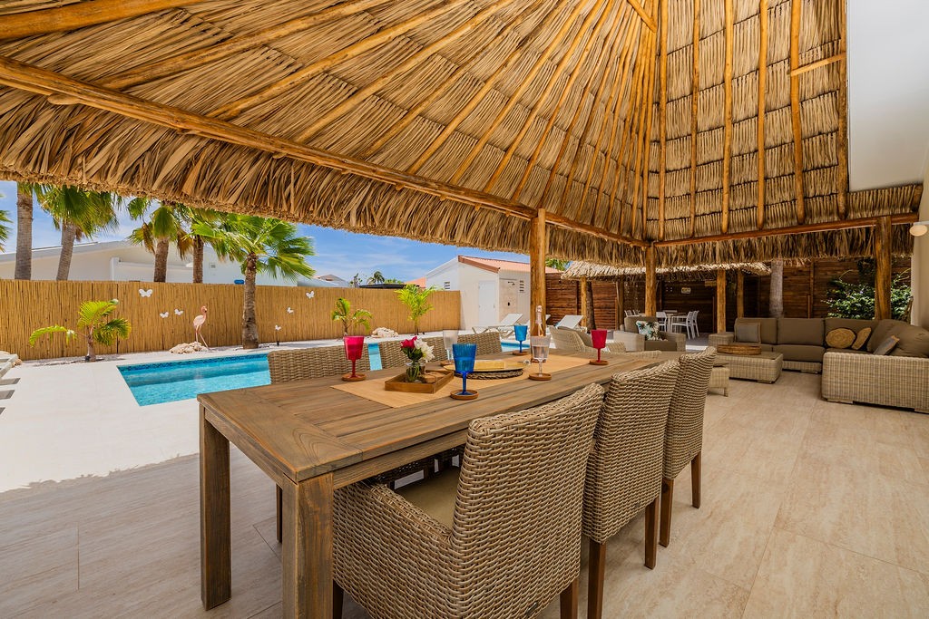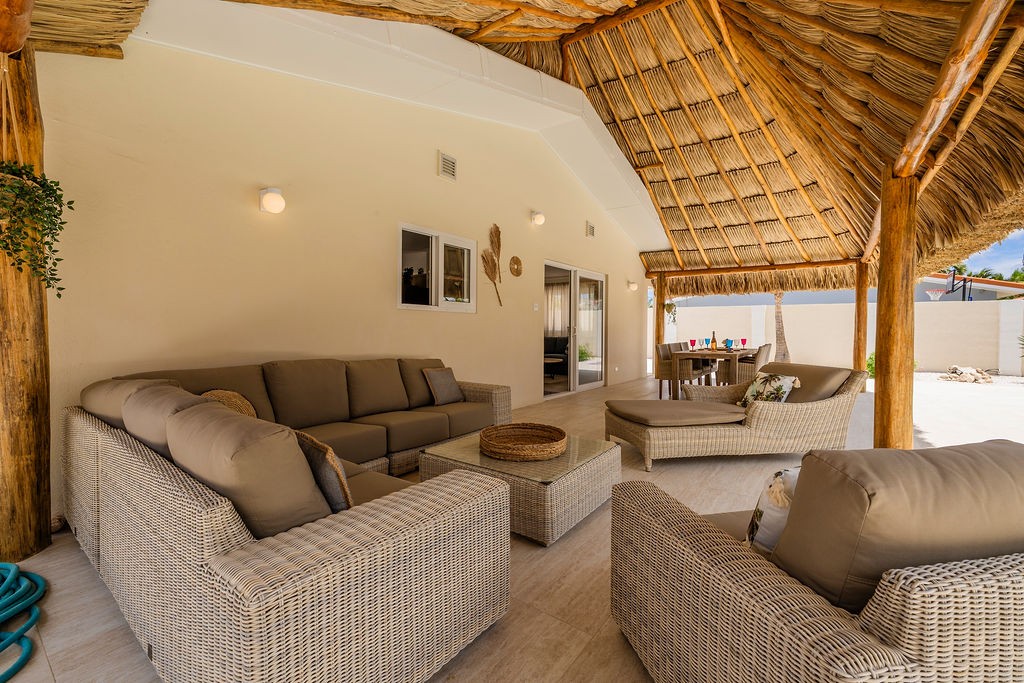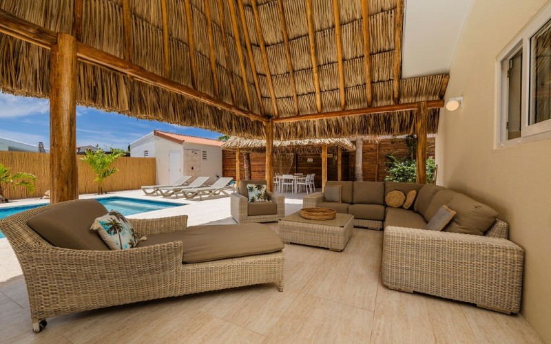 Welcome to Palapa Paradise Escape, a beautifully renovated 3-bedroom, 2-bathroom home featuring a large saltwater pool and multiple outdoor living spaces designed to enjoy Aruba’s sunshine and refreshing trade winds.