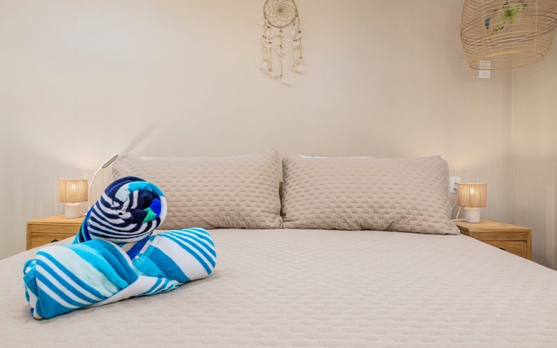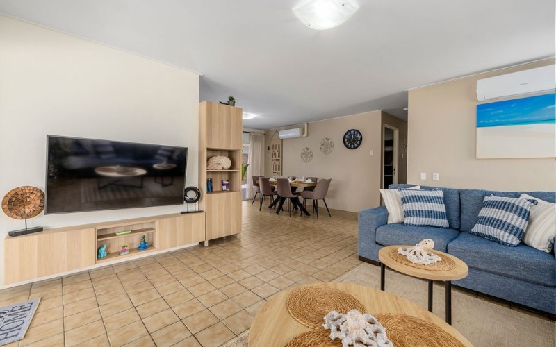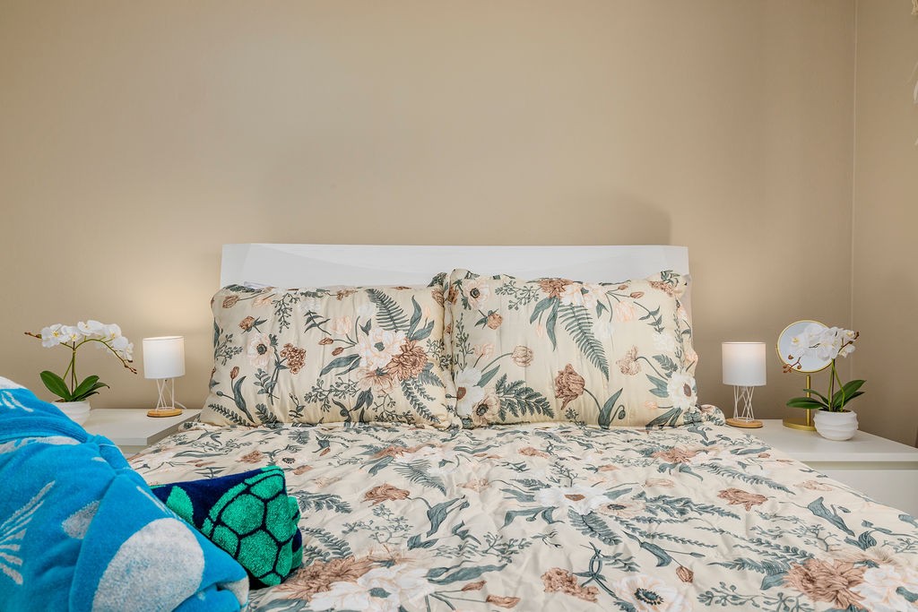 The primary bedroom suite features a California king bed complete with plush pillow top mattress, and a private ensuite bathroom for ultimate comfort and privacy. Two guest bedrooms share a full bathroom. Guest Bedroom 1 boosts a Queen bed perfect for stretching out after a full day of sunshine. Guest Bedroom 2 features Two single beds that can easily convert into a king to accommodate another couple or 2 singles.