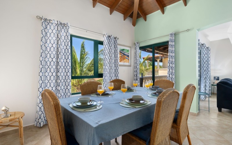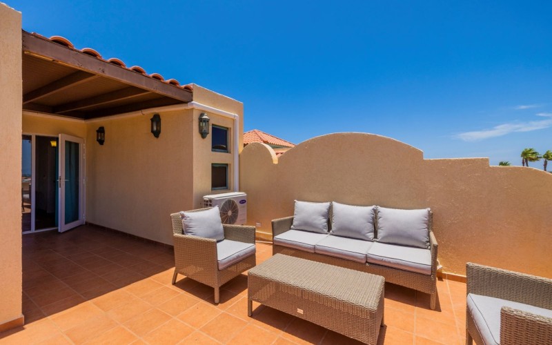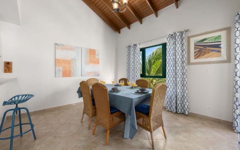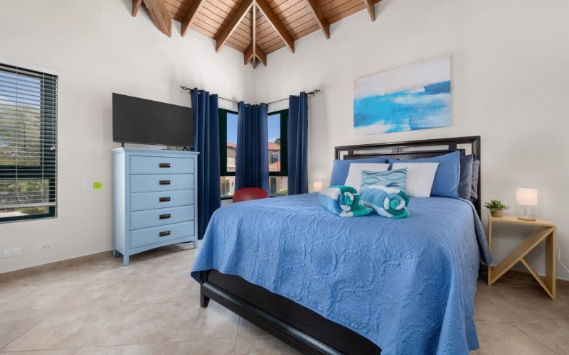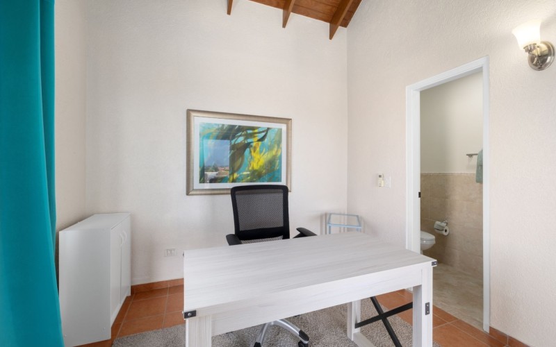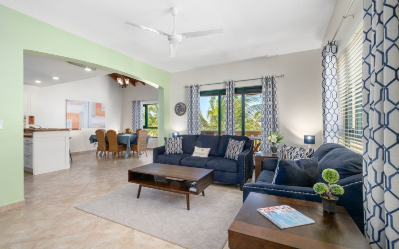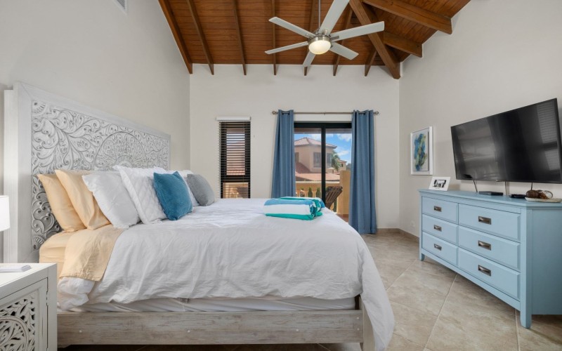 The primary bedroom boasts a comfortable king bed, a private ensuite with a double vanity, relaxing soaker tub, and an enclosed glass shower. Two additional spacious bedrooms each feature queen beds and share a modern bathroom. The open-concept living area includes a dining table with seating for six and additional seating at the breakfast bar. The modern kitchen is fully equipped with everything you need for preparing meals and entertaining. Comfortable seating areas provide ample space to relax and unwind. Just off the living/ dining area, you'll find a beautiful terrace perfect for outdoor dining with sea and golf course views. Ascend the staircase to the upper level to access the private office space, and spacious rooftop terrace offers breathtaking, sprawling views of the island, making it an ideal spot for enjoying the sunset or stargazing at night.