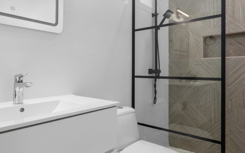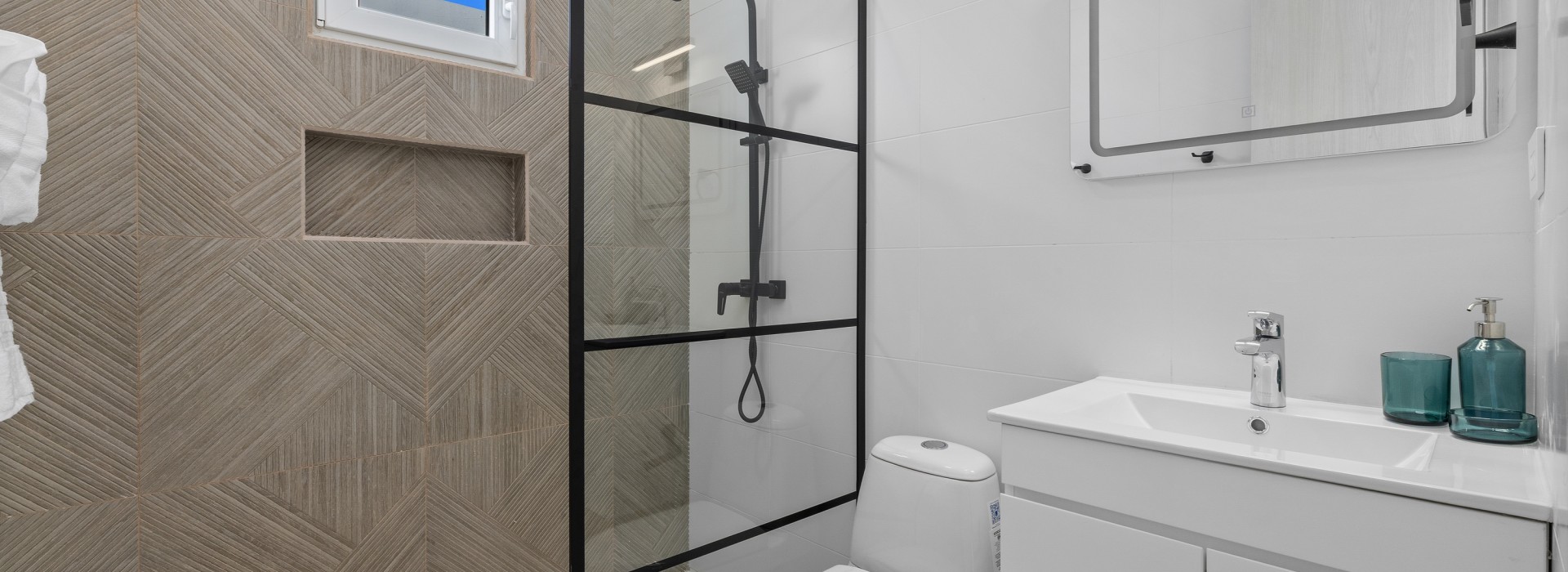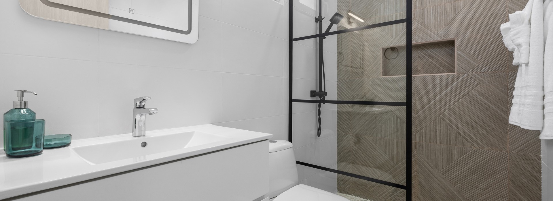 Primary Suite: King bed and sleek ensuite bathroom and smart TV